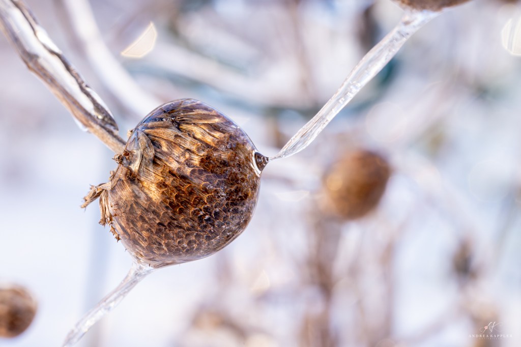 One more thing to mention is ice and ice storms. While I’m no fan of ice storms because of the damage they do to the birch and redbud trees in our yard, I do love photographing ice accumulation on plants and tree branches. I’m sure the neighbors think I’m a little nuts (or maybe really crazy) when I’m sticking my macro lens up to frozen branches and buds around my yard. Regardless of what they may think of me, I’m unashamed to be fascinated with the crazy patterns created by ice. Exploring them with my camera satisfies my childlike curiosity.