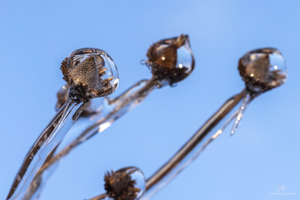 Since winter can be dull and dreary (especially when it doesn’t snow), I challenge myself to find pops of color in the landscape. Most flowers have finished blooming and created seed heads or withered away. This means only brightly-colored birds or berries populate the landscape with their colors. Winter nature photography challenges me to look for unusual visual treats that can’t be found in any other season, such as the frozen flower below.