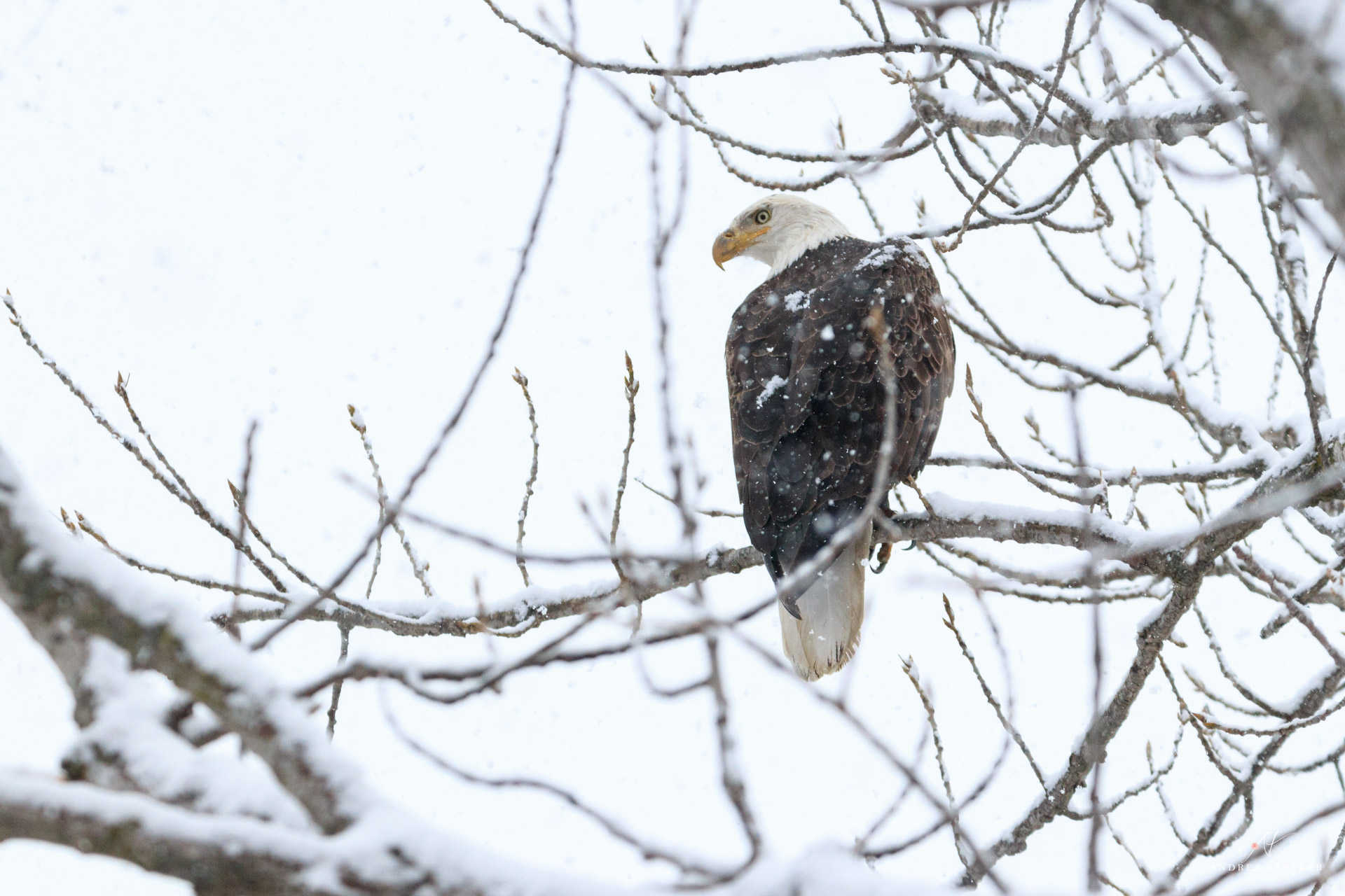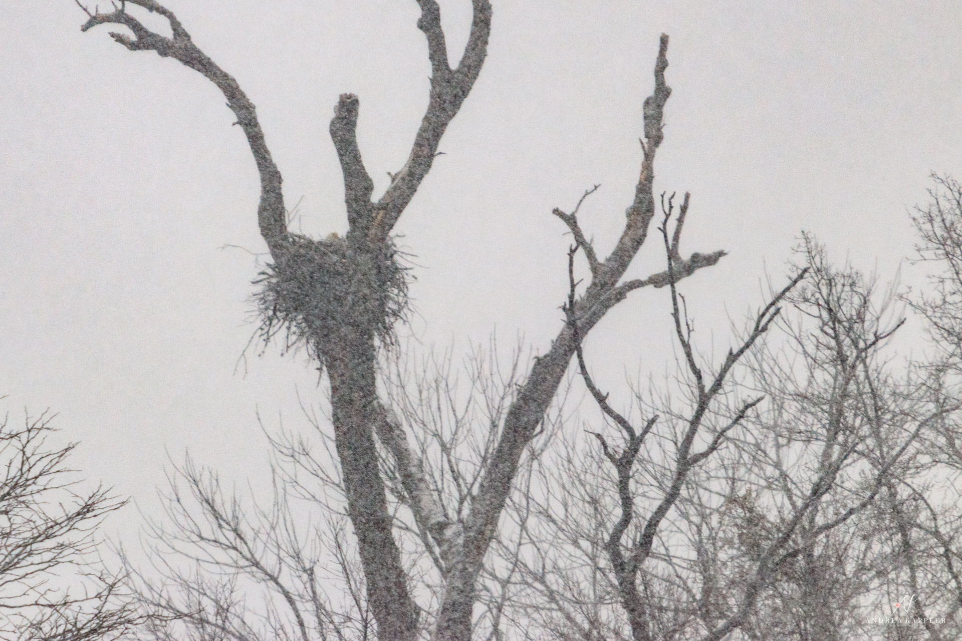 It’s hard to see here, but there’s an eagle sitting in the nest at the top of that tree. I was surprised to see her/him when I looked at the image on my computer screen. Thanks to the crazy falling snow and the great distance from me, I certainly didn’t see it that day.