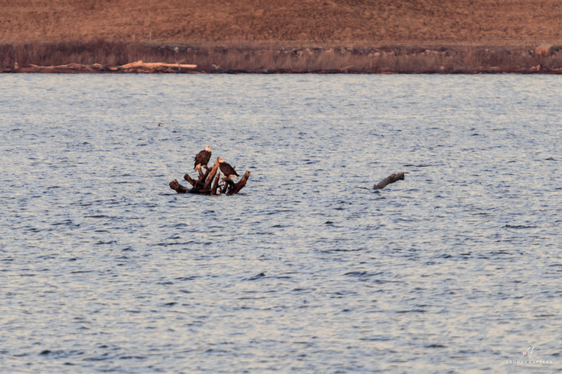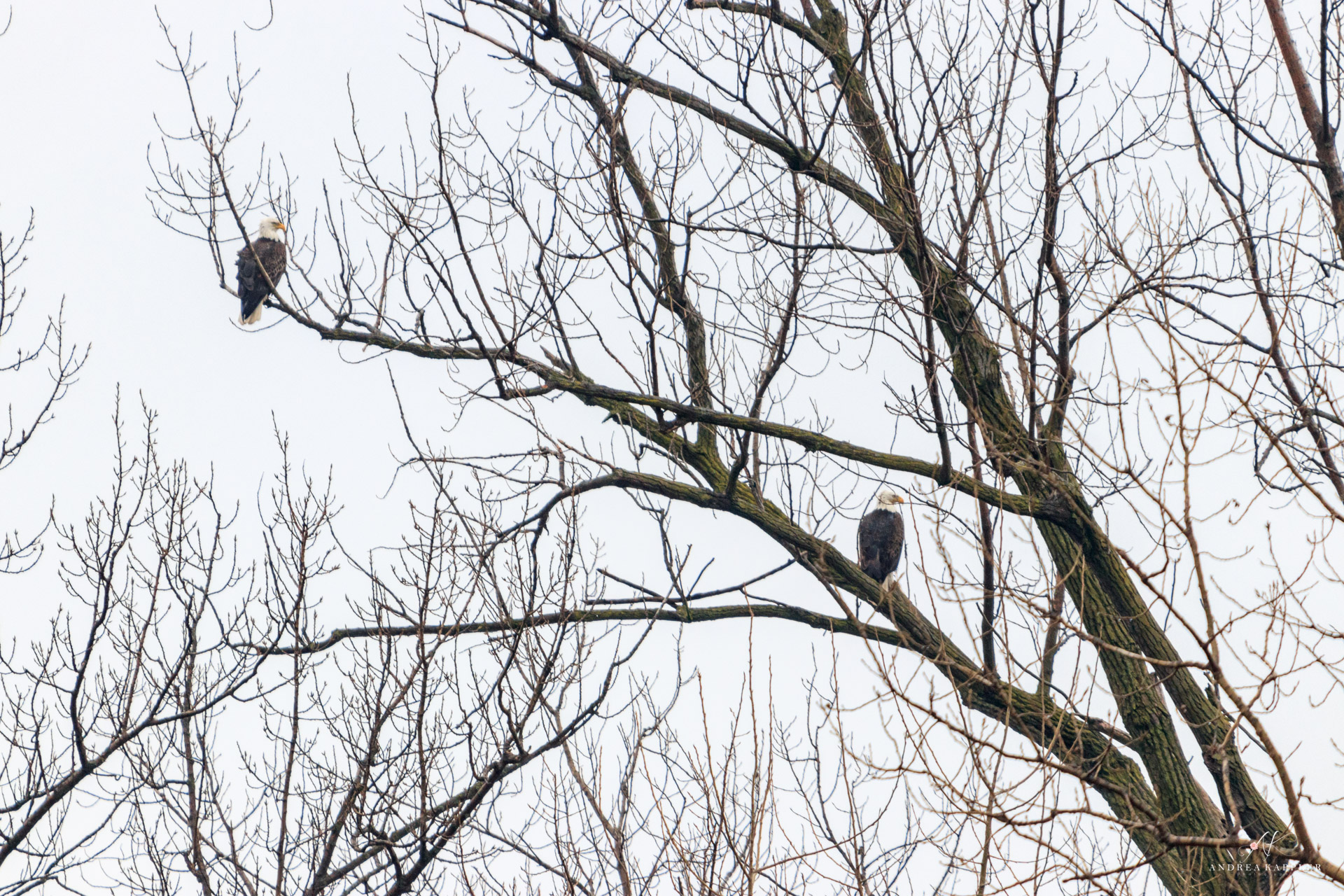After taking as many eagle pictures as we could, we moved on to the Audubon Center in Riverlands, in West Alton, IL, where we found two adult eagles sitting on a stump in a middle of a lake there. Unfortunately, we couldn’t get any closer to them than this, which was almost 1000mm magnification with my lens.