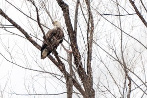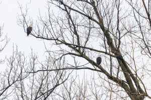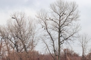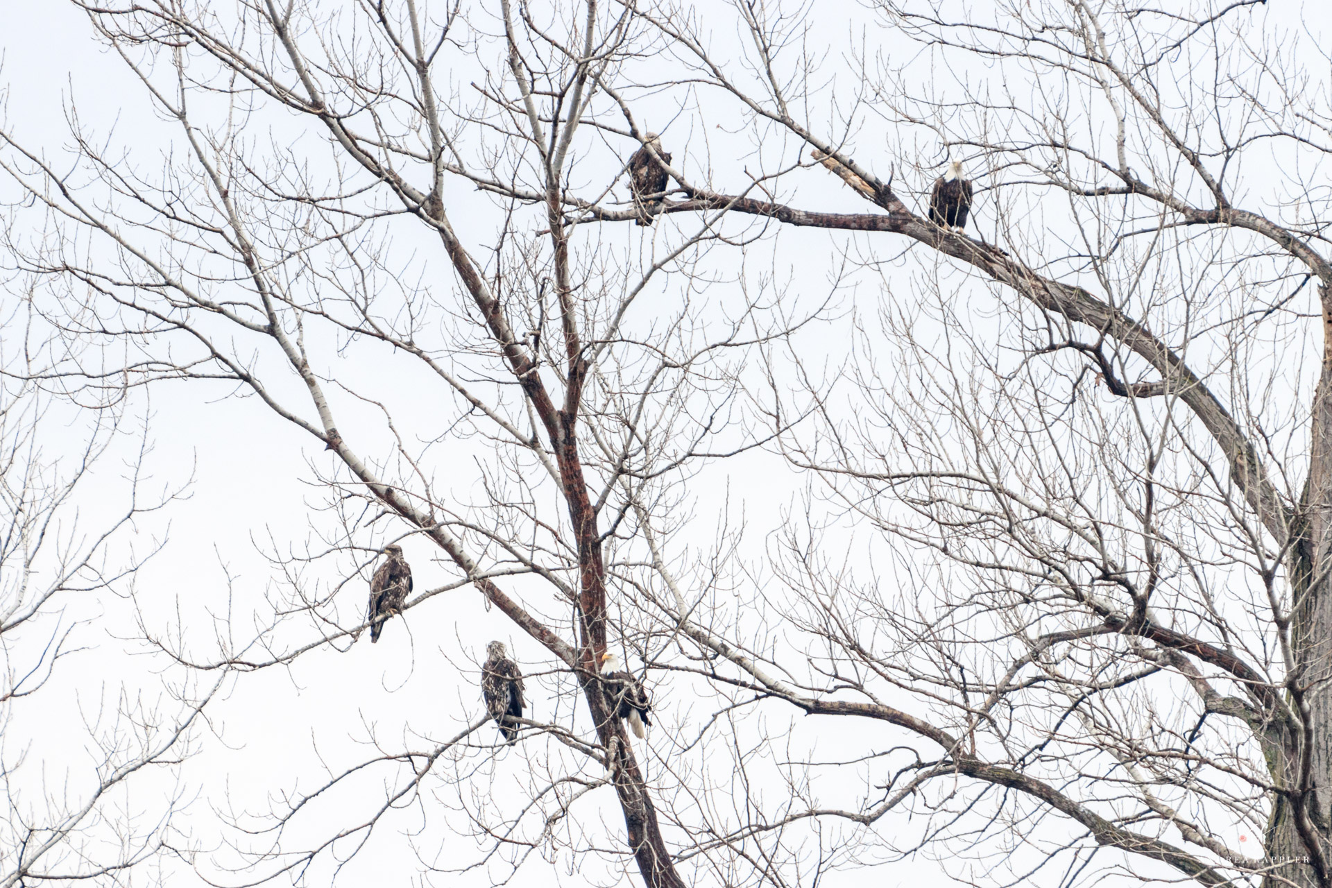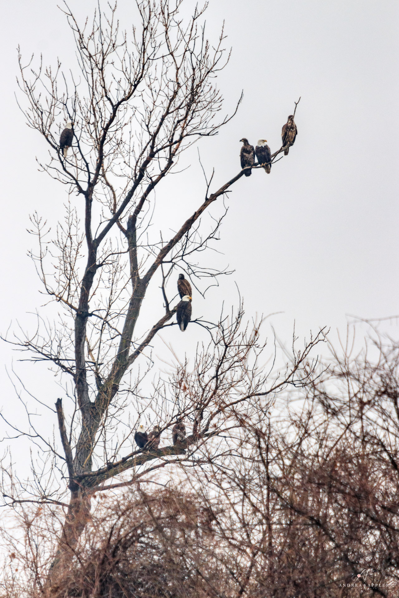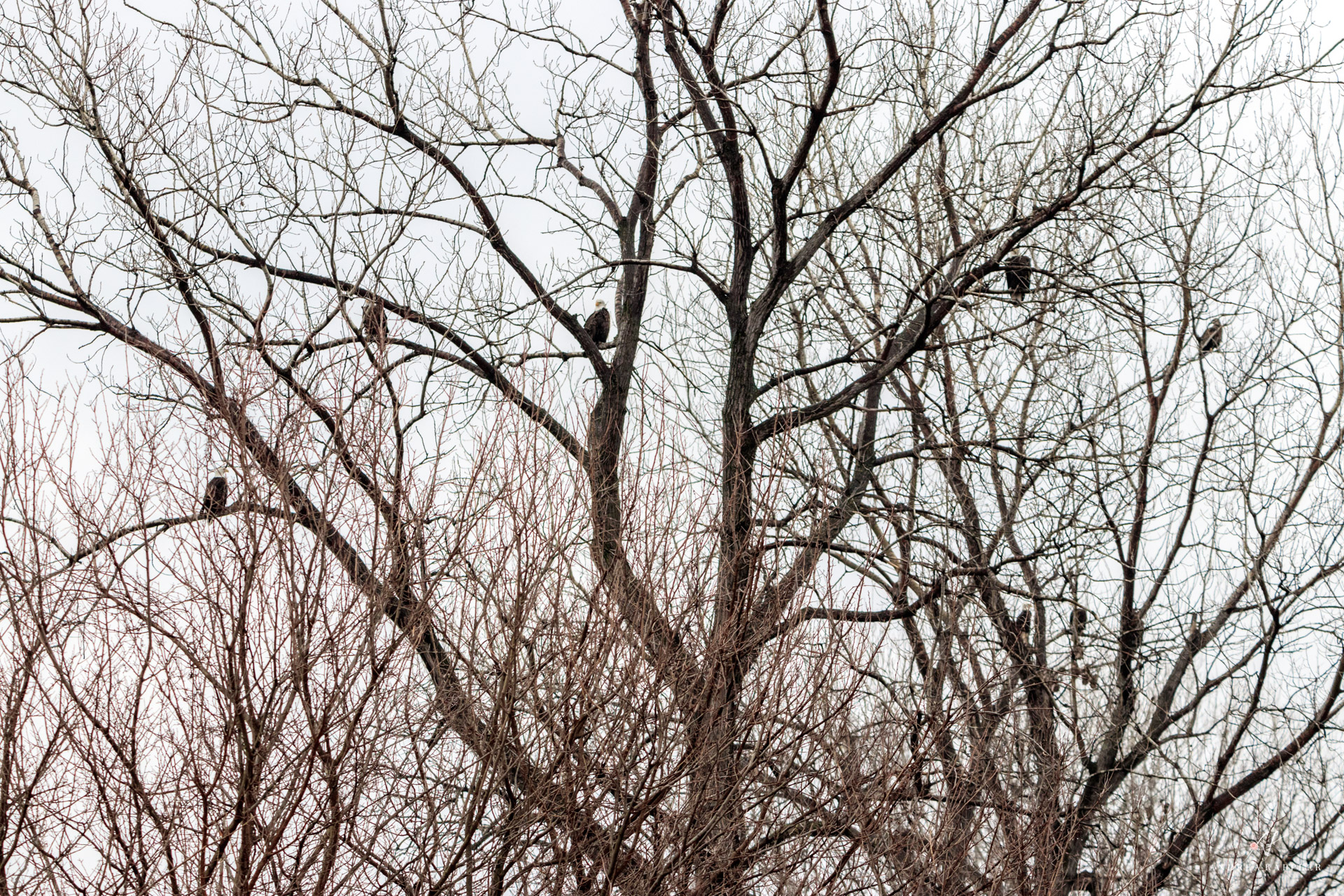 Here’s a picture of four adults and two juveniles in the first tree where we noticed they were sitting.Β This was just a drop in the bucket for how many we’d find in the neighboring trees. The following pictures are just tiny representations of the total number of eagles we saw sitting in the trees that day.