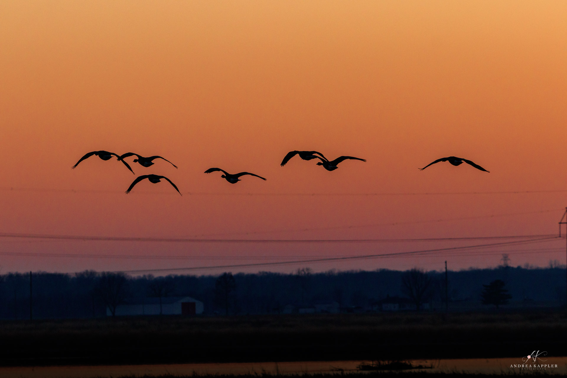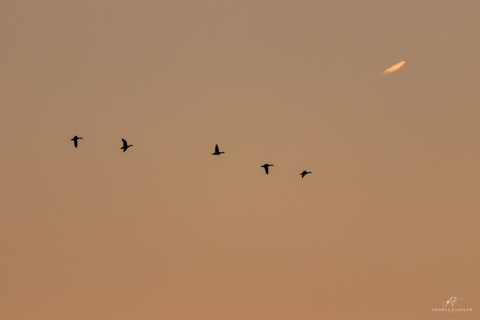 A few more ducks flying at dusk, with an airplane flying by overhead. We jokingly refer to airplanes as “mechanical eagles”. One of the many inside jokes between us.